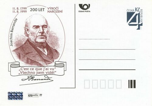 Пример маркированной почтовой карточки с напечатанным на лицевой стороне знаком почтовой оплаты (почтовой маркой) Чешской Республики: выпуск в честь Йоахима Барранда (1999)
