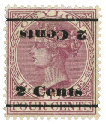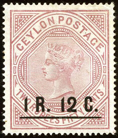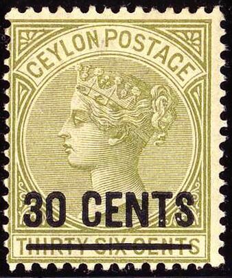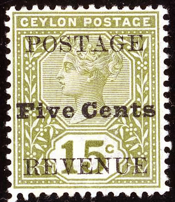 Примеры негашеных почтовых марок Британского Цейлона с надпечатками нового номинала (1888—1890)
