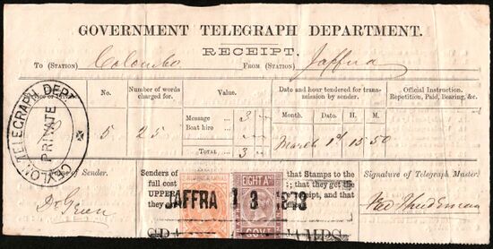 Квитанция оплаты телеграфных услуг в Коломбо (1873), на которую наклеены две верхние половины разрезанных пополам телеграфных марок Британской Индии