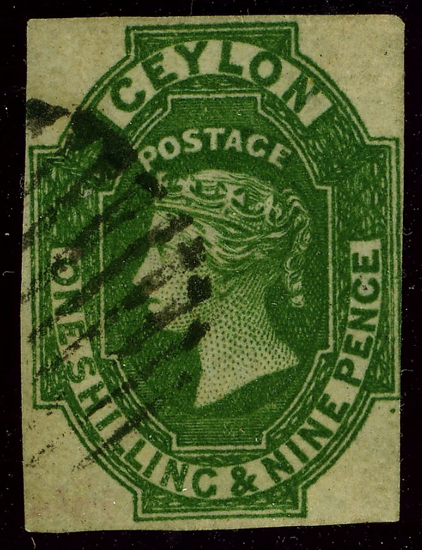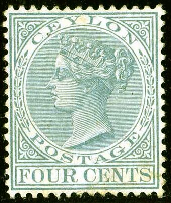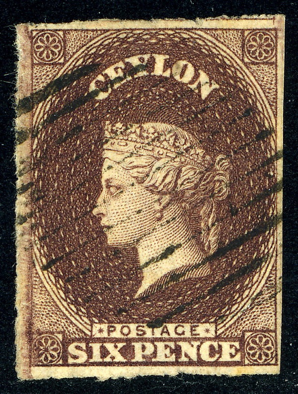 Первые почтовые марки для Британского Цейлона были выпущены 1 апреля 1857 года[1][3][4][7][11][12]. На марке пурпурно-коричневого цвета изображён профильный портрет королевы Виктории[3][13]. Номинал в 6 пенсов[7][13] предназначался для оплаты пересылки письма весом в пол-унции из Цейлона в Англию[13]. Марки были отпечатаны на голубоватой[3][13] и белой бумаге, без зубцов[3][≡][≡].