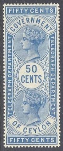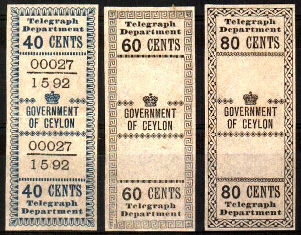 Первая серия собственных телеграфных марок была выпущена посредством надпечатки «Ceylon» («Цейлон») на марках Индии. В 1882 году были эмитированы марки с оригинальным рисунком[3][23]: