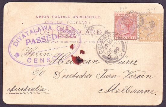 Прошедшие почту две марки колониального типа 1899 года выпуска (Mi #116, 119) на почтовой карточке, отправленной в Мельбурн из лагеря для военнопленных бурской войны в Дияталаве (1900)