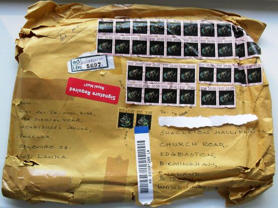 Международное заказное авиапочтовое отправление из Коломбо в Бирмингем, франкированное двумя марками из стандартной серии «Созвездия Зодиака» 2007 года — «Водолей», 20 рупий (Mi #1654A; Yt #1607; ВАРФ #046.07), и «Весы», 5 рупий (Mi #1658A; Yt #1612; ВАРФ #042.07)