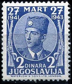 После нападения Германии на Югославию в апреле 1941 года югославское правительство переехало в Лондон. Правительство в эмиграции выпустило в марте и декабре 1943 года марки и блок, которые использовались для оплаты корреспонденции, перевозившейся на югославских кораблях. На марках первой серии правительства в эмиграции был изображён портрет царя Петра II Карагеоргиевича, на миниатюрах второй серии — выдающиеся деятели Югославии. Была также выпущена серия почтово-благотворительных марок с надпечатками в пользу Красного Креста[1][6].