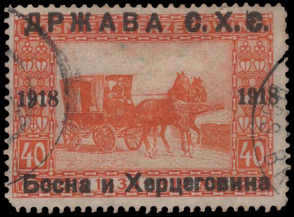 11 ноября 1918 года в обращение поступили серия из 16 марок Боснии и Герцеговины 1910 года с надпечаткой серб. «Држава С.Х.С. / 1918 / Босна и Херцеговина» или хорв. «Država S.H.S. / 1918 / Bosna i Hercegovina», подготовленные Сараевской почтовой дирекцией. В феврале 1919 года Сараевская дирекция выпустила серию из 18 марок Боснии и Герцеговины с надпечаткой «Краљевство С.Х.С.» или «Kraljevstvo S.H.S.». В этой серии существуют различные опечатки и разновидности[1][6].