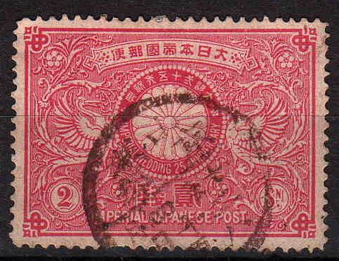 В 1900 году в ряде городов Китая начала работать японская консульская почта. Использовались почтовые марки Японии, на которых была сделана надпечатка слова «Китай» двумя иероглифами: яп. 那支[прим. 2][прим. 3]. 31 декабря 1922 года все японские почтовые отделения на территории Китая были закрыты, а почтовые марки вышли из обращения[4].