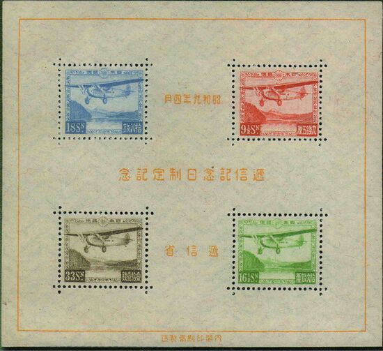 Первый почтовый блок (с авиапочтовыми марками), выпущенный в Японии в 1934 году