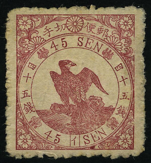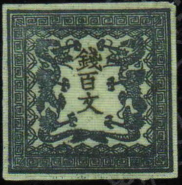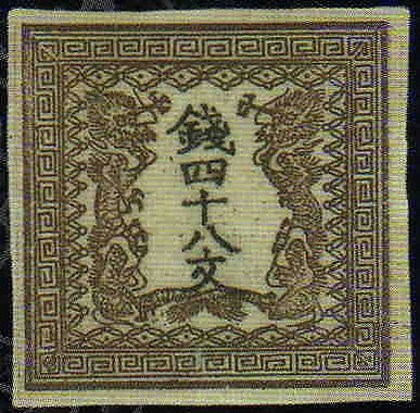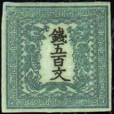 Первые японские почтовые марки появились в апреле 1871 года[4]. Это была серия из четырёх марок, номиналы которых соответствовали различным почтовых тарифам. Замысловатый рисунок в двух цветах состоял из пары драконов, обращённых мордами к центру, где чёрным цветом были напечатаны иероглифы, обозначающие номинал. Название государства на марках указано не было. Все надписи на марках были даны на японском языке[1][4]. Номиналы были указаны в монах: 48, 100, 200 и 500 монов. Печать почтовых марок каждого номинала производилась с помощью двух печатных плат на бумаге двух сортов, благодаря чему известны много их разновидностей[1]. В Японии первую серию марок принято называть «марками с драконами» (яп. Марка 竜切 рю:киттэ).