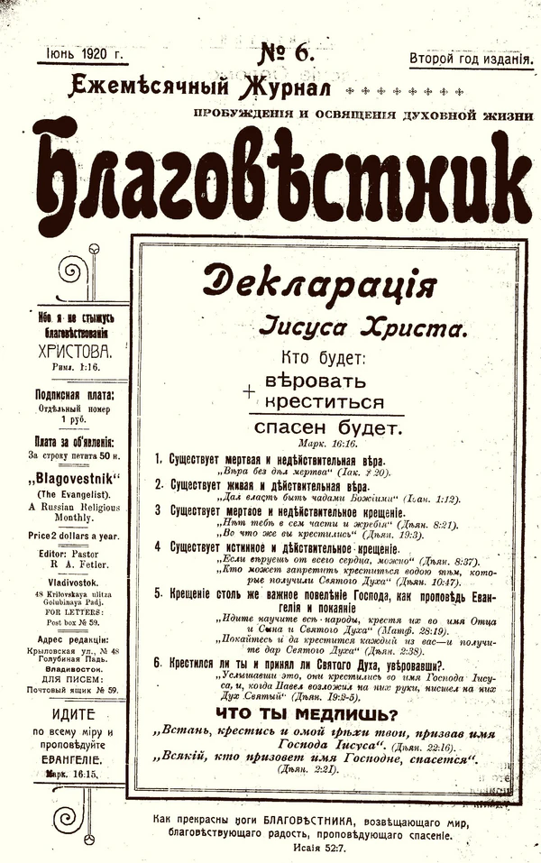 Во второй половине XIX в. в России, наряду со старыми русскими формами христианского сектантства (христововерами, духоборцами, молоканами и др.), начинают формироваться различные направления так называемого евангельского христианства: баптисты, евангельские христиане, адвентисты седьмого дня, а в начале XX в. и христиане веры евангельской — пятидесятники. Будучи первоначально привнесенными миссионерами из западноевропейских стран и Америки в немецкие колонии Юга России и Поволжья (баптизм, адвентизм) и частично в великосветскую среду Петербурга (евангельское христианство), они постепенно распространились среди коренного (прежде всего сельского) населения, со временем осваивая и городскую среду[4].