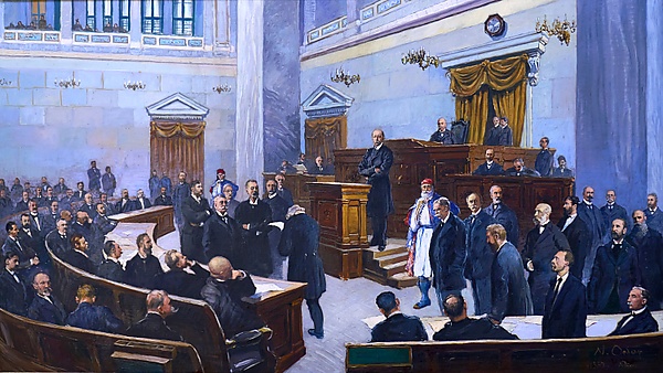 В 1896 году новое восстание на Крите вызвало в Греции сильное национальное движение. Правительство на этот раз дало втянуть себя в войну с Турцией, которая закончилась полным поражением греков. Благодаря вмешательству великих держав, Греция была спасена от территориальных потерь, но обязалась уплатить Турции военную контрибуцию в 4 млн турецких фунтов и ещё 100 тысяч фунтов частным лицам. Греция также должна была признать установления финансовой контрольной комиссии из представителей великих держав. С назначением международной финансовой комиссии государственное хозяйство было в некоторой степени упорядочено: дефициты исчезли, и проценты по государственным долгам начали выплачиваться вовремя. С 1899 года был проведён ряд реформ: налоговой системы, суда, администрации и школ. Борьба политических партий, которые группировались вокруг крупнейших политический деятелей — Теодороса Делиянниса и Харилаоса Трикуписа нередко выливалась в народные волнения, вызывавшие частые смены правительства.