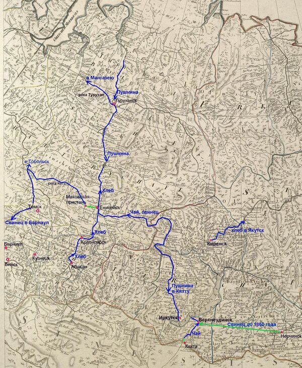 С середины XVIII века до 1850 года через Енисейск поставляется свинец с Нерчинских рудников на алтайские заводы. Всего с 1747 года по 1850 год с Нерчинских заводов на Алтай было доставлено более 1,6 млн пудов свинца.