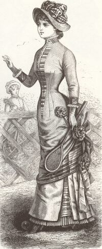 В первые годы существования лаун-тенниса спортивная форма была довольно неудобной. Так, первая чемпионка Уимблдонского турнира, Мод Уотсон, завоевала свой титул в юбке с турнюром и мужской соломенной шляпе, а ещё раньше женщины играли в костюмах из фланели и саржи, а иногда даже в мехах. Лотти Дод, самая юная чемпионка Уимблдона, уже носила доходившие до середины голени юбки, бывшие частью её школьной формы, а в 1905 году американка Мэй Саттон позволила себе выйти на корт с закатанными рукавами. Тем не менее нижние юбки и корсеты оставались частью женской теннисной формы до Первой мировой войны[66].