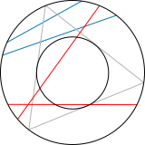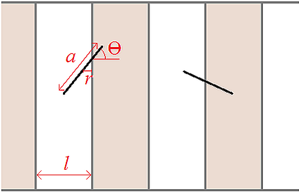 Подход Симпсона развил Жорж-Луи де Бюффон, который в 1777 году привёл классический пример задачи на геометрическую вероятность[31]. Это была занимавшая впоследствии многих математиков «задача Бюффона о бросании иглы»: плоскость разграфлена «в линейку», на неё наудачу бросается игла, требуется найти вероятность того, что игла пересечёт линию[33]. Если длина иглы меньше, чем расстояние между линиями , то искомая вероятность равна . Данная формула была несколько раз проверена экспериментально, в том числе самим Бюффоном, а в 1901 году итальянский математик Марио Лаццарини (Mario Lazzarini) использовал её для опытного определения числа . Задача Бюффона, её анализ и различные модификации обсуждались математиками многие годы[34].