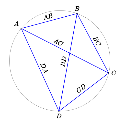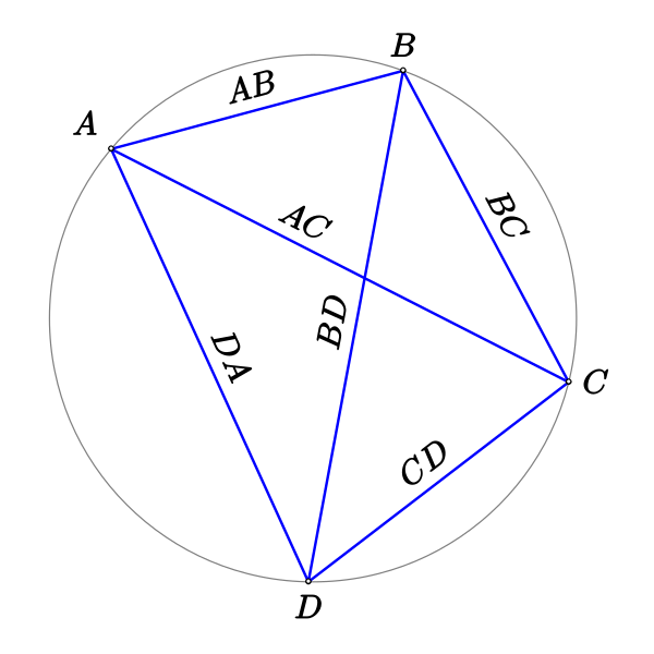 Позднее астроном II века Клавдий Птолемей в «Альмагесте» дополнил результаты Гиппарха. Тринадцать книг «Альмагеста» — самая значимая тригонометрическая работа всей античности. В частности, «Альмагест» содержит обширные пятизначные таблицы хорд для острых и тупых углов, с шагом 30 угловых минут[1]. Для вычисления хорд Птолемей использовал (в главе X) теорему Птолемея (известную, впрочем, ещё Архимеду), которая утверждает: сумма произведений длин противоположных сторон выпуклого вписанного в круг четырёхугольника равна произведению длин его диагоналей. Из этой теоремы нетрудно вывести две формулы для синуса и косинуса суммы углов и ещё две для синуса и косинуса разности углов, однако общая формулировка этих теорем у греков отсутствует[21].