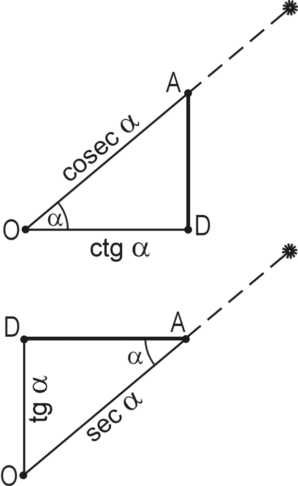Самые ранние из сохранившихся трудов принадлежат ал-Хорезми и ал-Марвази (IX век), которые рассмотрели, наряду с известными ещё индийцам синусом и косинусом, новые тригонометрические функции: тангенс, котангенс, секанс и косеканс[34]. Изначально эти функции определялись иначе, чем в современной математике. Так, под котангенсом понималась длина тени от вертикального гномона высотой 12 (иногда 7) единиц; первоначально эти понятия использовались для расчёта солнечных часов. Тангенсом называлась тень от горизонтального гномона. Косекансом и секансом назывались гипотенузы соответствующих прямоугольных треугольников (отрезки AO на рисунке справа)[48]. Лишь в X веке философ и математик ал-Фараби в своих комментариях к «Альмагесту» ввёл независимые от гномоники определения этих четырёх функций, определив их через синус и косинус в тригонометрическом круге птолемеевского радиуса (60 единиц). Основные соотношения между всеми шестью функциями привёл ал-Баттани в том же столетии. Окончательной унификации добился Абу-л-Вафа во второй половине X века, который впервые использовал для определения тригонометрических функций круг единичного радиуса, как это делается в современной математике.