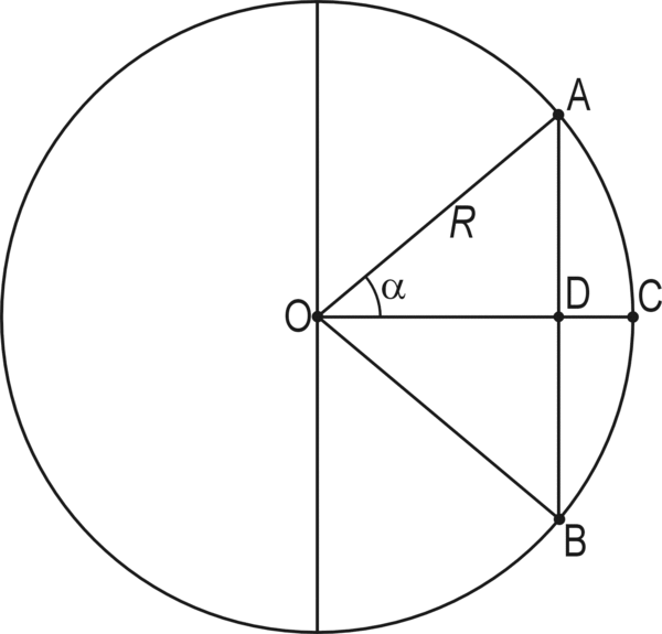 При этом радиус круга не считался равным единице, как сейчас. Например, у Гиппарха радиус круга предположительно считался равным R=3438 единиц — при таком определении длина дуги окружности была равна угловой мере этой дуги, выраженной в минутах: , и это облегчало вычисления. У Птолемея R=60 единиц. Согласно современным реконструкциям[16][19], величины хорд у Гиппарха были протабулированы с интервалом 7°30'. Возможно, в основе вычисления таблицы Гиппарха лежал метод, разработанный Архимедом и восходящий ещё к Аристарху[20].