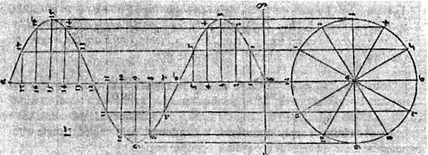 Первый график синусоиды появился в книге Альбрехта Дюрера «Руководство к измерению циркулем и линейкой» (нем. Underweysung der Messung mit dem Zirkel und Richtscheyt, 1525 год)[72]. В 1630-х годах Жиль Роберваль, в ходе своих исследований циклоиды, независимо вычертил синусоиду[73], он же опубликовал формулу тангенса двойного угла[52]. Джон Валлис в своей «Механике» (1670), опередив своё время, правильно указал знаки синуса во всех квадрантах и указал, что у синусоиды бесконечно много «оборотов». График тангенса для первого квадранта впервые начертил Джеймс Грегори (1668)[74].