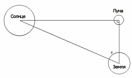 Дальнейшее развитие тригонометрии связано с именем астронома Аристарха Самосского (III век до н. э.). В его трактате «О величинах и расстояниях Солнца и Луны» ставилась задача об определении расстояний до небесных тел; эта задача требовала вычисления отношения сторон прямоугольного треугольника при известном значении одного из углов. Аристарх рассматривал прямоугольный треугольник, образованный Солнцем, Луной и Землёй во время квадратуры. Ему требовалось вычислить величину гипотенузы (расстояние от Земли до Солнца) через катет (расстояние от Земли до Луны) при известном значении прилежащего угла (87°), что эквивалентно вычислению значения . По оценке Аристарха, эта величина лежит в промежутке от 1/20 до 1/18, то есть расстояние до Солнца в 20 раз больше, чем до Луны[12]; на самом деле Солнце почти в 400 раз дальше, чем Луна, ошибка возникла из-за неточности в измерении угла. Попутно Аристарх доказал неравенство, которое в современных терминах передаётся формулой: