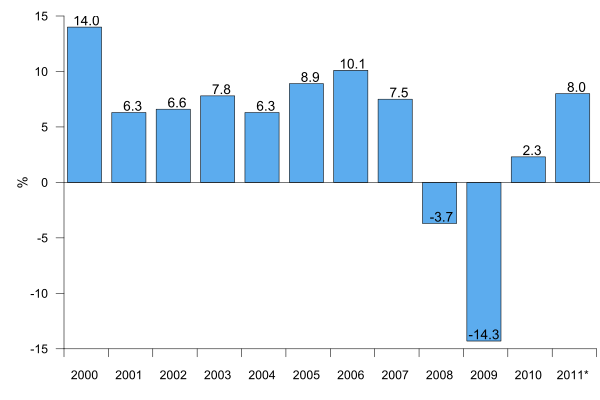 Впервые за десятилетие рост ВВП по сравнению с аналогичным периодом прошлого года упал до нуля[40]. Причинами считаются мировой экономический кризис и, как следствие, сокращение внутреннего спроса, уменьшение экспорта (включая российский транзит), снижение инвестиций и доли прибавочной стоимости на основных рынках, демонстрировавших рост в последние пять лет[40][41].