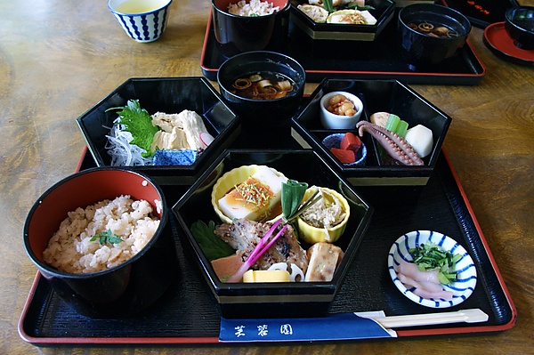 Питание периода Эдо имеет общие элементы с питанием современных японцев, за некоторыми значительными исключениями, среди которых отсутствие мяса и более редкое присутствие рыбы и морепродуктов. Оно состояло из трёх приёмов пищи, как и сейчас, следуя принципу нынешнего меню: чаша риса, суп и одно или два гарнирных блюда[32]. Благодаря многочисленным документам удалось реконструировать диету даймё, которая менялась от обычных трапез к церемониальным. Обычные трапезы, как правило, состояли из риса, супа и одного или двух гарниров, таких как цукэмоно; саке не подавалось. Церемониальная трапеза, обычно подаваемая вечером, была формальным ужином, сопровождаемым ритуалом дегустации саке, и проходила раз в неделю[33]. Наиболее распространёнными ингредиентами были рис, тофу, редька, сезонные овощи и грибы. Присутствие рыбы в обычных меню варьировалось в зависимости от периода (иногда редко, иногда чаще), за исключением кацуобуси, часто используемого в качестве приправы, но в любом случае рыба потреблялась чаще во время церемониальных трапез[33].