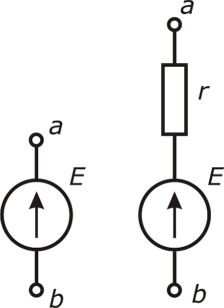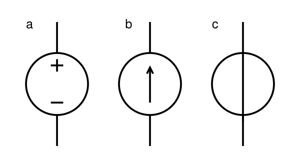 Существуют различные варианты обозначений источника напряжения. Наиболее часто встречается обозначение (a) . Вариант (c) устанавливается ГОСТ[1] и IEC[2]. Стрелка в кружке указывает на положительную клемму на выходе источника. При выборе обозначения нужно быть осмотрительным и использовать пояснения, чтобы не допускать путаницы с источниками тока (b), который обозначен так в статье «Источник тока».