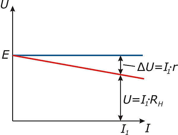 На рисунке 3 приведены нагрузочные характеристики идеального источника напряжения (синяя линия) и реального источника напряжения (красная линия).