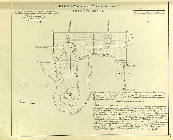 ВОСКРЕСЕНСК, заштатный город, купцов 12, мещан 321, квартира Пристава 2-го стана. Вознесенская ярмарка в день Вознесения Господня, 20 верст от уездн. гор., на дороге из Москвы в Волоколамск.