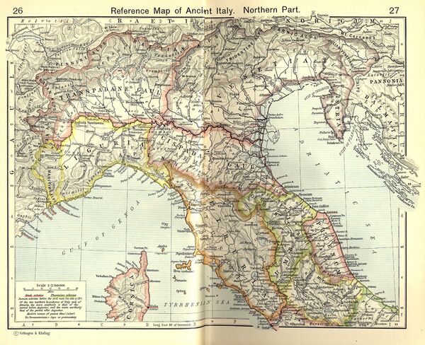 В 49 году до нашей эры вместе с Lex Roscia Юлий Цезарь дал римское гражданство жителям Цизальпийской Галлии[11]; в 42 году до нашей эры существовавшая до сих пор провинция была упразднена, что расширило Италию на север вплоть до южного подножия Альп[12][13].