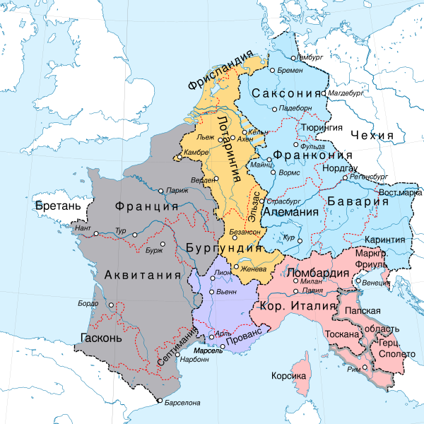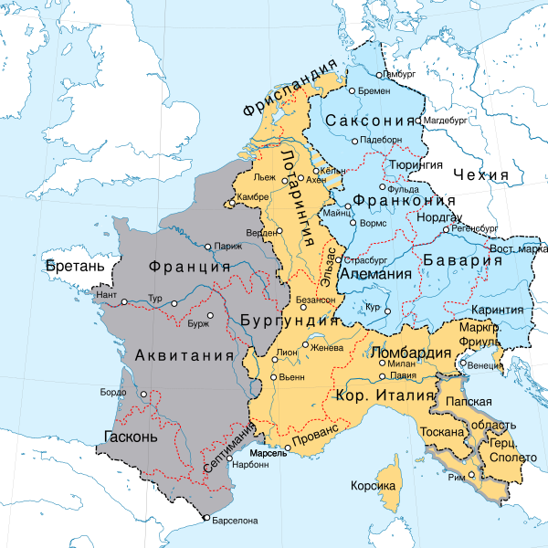 По Верденскому договору 843 года Лотарь I получил в управление так называемое Срединное королевство, в которое, кроме Италии, вошла полоса земель от Нидерландов до Прованса. Кроме того, Лотарь I сохранял титул императора, который фактически оказался привязан к титулу короля Италии.