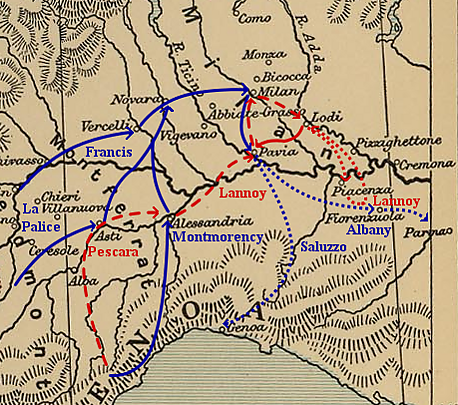 В начале декабря испанские войска под командованием Уго де Монкада высадились возле Генуи, намереваясь вмешаться в борьбу между профранцузской и прогабсбургской фракциями в городе. Для их перехвата Франциск выделил крупные силы под командованием маркграфа Салуццо Микеле Антонио. Столкнувшись с превосходящими французскими силами, и оставшись без поддержки с моря из-за прибытия генуэзского флота под командованием профранцузски настроенного адмирала Андреа Дориа, испанцы сдались. После этого Франциск подписал секретное соглашение с папой Климентом VII, который пообещал не помогать Карлу в обмен на помощь Франциска в завоевании Неаполя. Несмотря на протесты высокопоставленных командующих, Франциск отправил часть своих сил под командованием Джона Стюарта на юг на помощь Папе. Ланнуа попытался перехватить экспедицию возле Фьоренцуолы, но понёс тяжёлые потери, и был вынужден вернуться в Лоди из-за вмешательства тогда ещё малоизвестных «чёрных отрядов» Джованни де Медичи, только что пришедших на французскую службу. Медичи вернулся к Павии с конвоем с порохом и пулями, посланным герцогом Феррары, однако положение французов одновременно стало слабее из-за ухода почти 5 тысяч граубюнденских швейцарцев, вернувшихся на защиту своих кантонов, которые подвергались разграблениям со стороны мародёрствующих ландскнехтов.