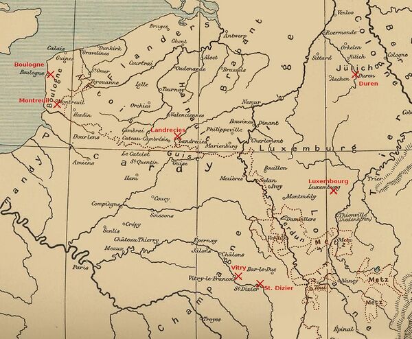В северной Франции развернулись боевые действия. По приказу Генриха сэр Джон Уоллоп высадился в Кале с 5 тысячами человек, предназначенными для обороны Нидерландов. Тем временем, Антуан де Бурбон и д’Аннебо взяли ряд городов, а Юлих-Клеве-Бергский герцог Вильгельм открыто перешёл на сторону Франции и вторгся в Брабант; начались бои в Артуа и Эно. По неизвестной причине Франциск остановился со своей армией под Реймсом, в то время как Карл атаковал Вильгельма, вторгся в Юлих-Берг и разграбил Дюрен.