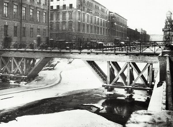 В 1896 году на месте бывшего яличного перевоза по проекту инженера Л. Н. Колпицына был возведён однопролётный деревянный мост[5][6]. Финансировал строительство сам Колпицын, смета составила 3500 руб. Торжественное открытие моста состоялось 6 октября 1896 года[7][8]. Пролётное строение состояло из 10 дощато-гвоздевых ферм раскосной системы, пролёт в свету был равен 19,7 м[9][10]. Основанием для моста служила стенка набережной. Характерными особенностями моста являлись его положение над каналом (для сохранения подмостного габарита пришлось построить с обеих сторон наружные лестницы для подъёма на мост), а также новое для мостостроения того времени использование ксилолитовых плит для мощения мостового полотна[9][8]. Длина моста составляла 21,7 м, ширина — 2,6 м[11]. В 1902 году мост был перестроен по проекту архитектора К. В. Бальди с заменой ксилолитовых плит дощатым настилом. В 1911—1912 годах переправа была перестроена по проекту инженера К. В. Ефимьева. Новый мост был брусчатым, подкосной системы, опорами для него служили трёхрядные деревянные сваи в двух взаимно перпендикулярных направлениях; при этом пролёт его уменьшился до 9,1 м[9][10].