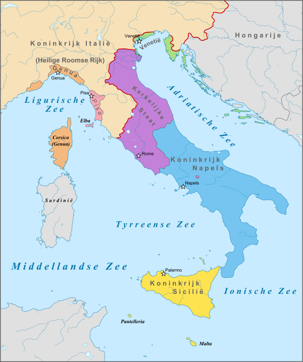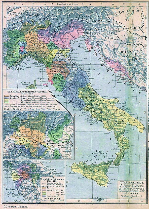 Северная Италия и верхняя Центральная Италия были разделены на множество враждующих городов-государств, самыми могущественными были Милан, Флоренция, Пиза, Сиена, Генуя, Феррара, Мантуя, Верона и Венеция.