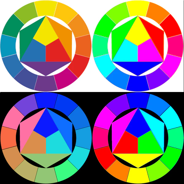 Чистый цвет можно изменить, добавляя его дополнительные. Фиолетовый с включением жёлтого изменяется в промежутке от светло-жёлтого до тёмно-фиолетового. Зелёный и красный не испытывают больших изменений тональности, но смешение обращает их в серо-чёрные. Осветление белым дополнительных цветов выражается исключительно сложными тонами.