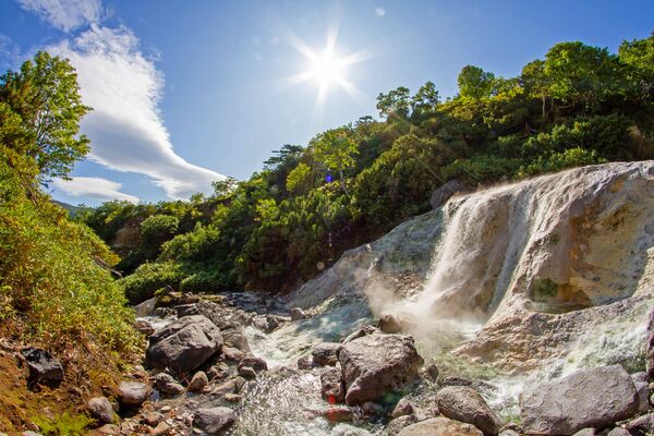 Остров вытянут с северо-востока на юго-запад на 200 км, ширина составляет от 7 до 27 км. Площадь — 3174,71 км²[9]. Длина береговой линии достигает 581,9 км[10]. Состоит из вулканических массивов и горных кряжей. На острове насчитывается 20 вулканов[8], из них девять — действующие: Кудрявый (986 м), Меньший Брат (562 м), Чирип (1589 м), Богдан Хмельницкий (1585 м), Баранского (1134 м), Иван Грозный (1159 м), Стокап (1634 м)[8], Атсонупури (1205 м), Берутарубе (1223 м). На острове множество водопадов, в том числе один из самых высоких в России — водопад Илья Муромец (141 м), находящийся на полуострове Медвежий; озёра, горячие и минеральные источники. У входа в залив Львиная Пасть расположен остров Камень-Лев высотой 162,4 метра[11]. У тихоокеанской стороны расположен о. Одинокий[12].