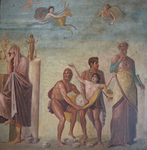 «Ифигения» Эсхила посвящена популярному в античную эпоху сюжету. Заглавная героиня трагедии — дочь царя Микен Агамемнона и его жены Клитемнестры, которую родной отец должен принести в жертву, чтобы умилостивить Артемиду (с чем связан у Эсхила гнев этой богини, остаётся неясным). Без такого жертвоприношения греческий флот не смог бы отплыть из Авлиды к Трое, а потому Агамемнон вызывает дочь к себе, обманув её обещанием брака с Ахиллом, и царевна безропотно ложится на алтарь. Неизвестно, происходило ли в этой трагедии чудесное спасение Ифигении: в одной из версий мифа Артемида в последний момент подменила эту героиню ланью[1].