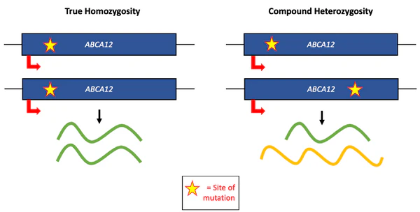 Два генетических механизма, которые могут привести к ихтиозу Арлекина — мутация в гене ABCA12[15] ,[16] .Этот ген важен в регуляции синтеза белка для развития кожного слоя. Мутация в гене вызывает нарушение транспорта липидов в коже и может также привести к уменьшению количества белков, ответственных за развитие кожи. Менее серьёзные мутации приводят к образованию коллодиевой мембраны и врождённой ихтиозиформной эритродермии[17][18].