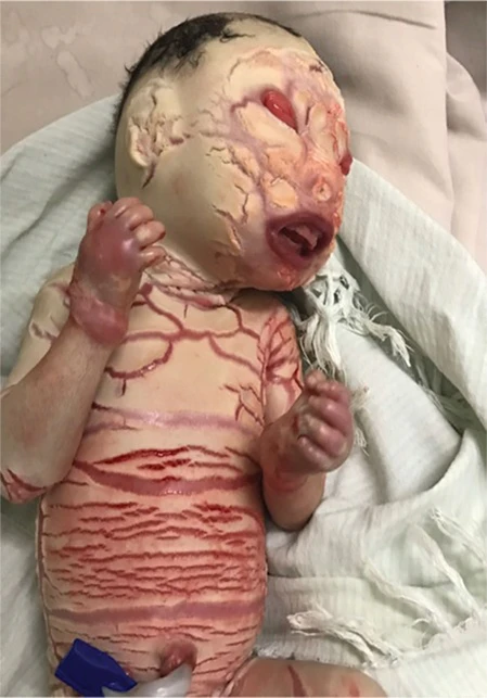 Относится к редким тяжёлым заболеваниям из группы ихтиозиформных эритродермий с аутосомно-рецессивным типом наследования[3]. На коже образуются большие пластины ромбовидной, трапециевидной или прямоугольной формы, разделённые глубокими трещинами[4]. Трещины влияют на форму век, носа, рта и ушей и ограничивают движения рук и ног[4]. Ограничение движения грудной клетки может привести к затруднению дыхания[4]. Другие осложнения могут включать преждевременные роды, инфекцию, проблемы с температурой тела, и обезвоживание[4][5]. Это заболевание является наиболее тяжелой формой ихтиоза (если не считать синдромы, которые включают ихтиоз, к примеру, синдром Ноя-Лаксовой)[6].
