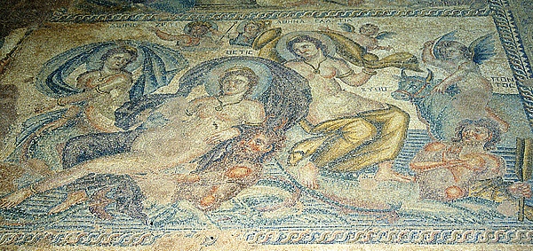 На пафосской мозаике изображен только Бифос, несущий нереид, Фетида вместе с двумя другими нереидами, Дорида и Галатея.