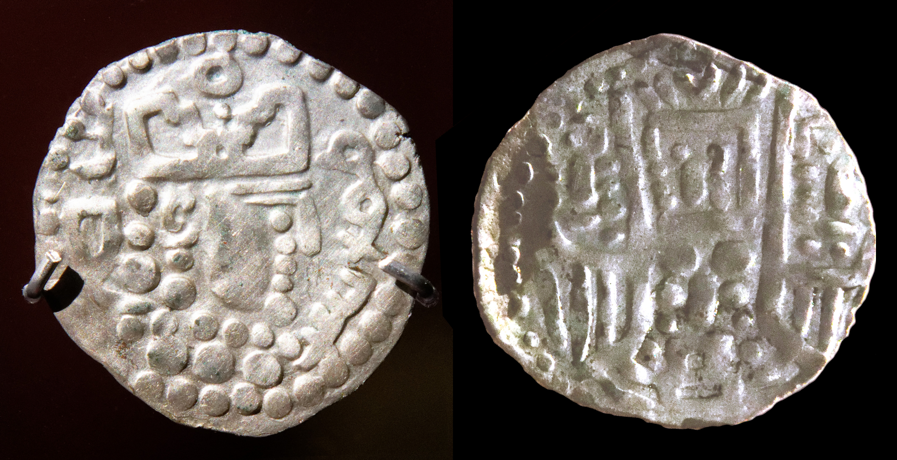 Монета согдийского правителя Тургара, ихшида Самарканда. Профиль и имя правителя на аверсе, алтарь огня с сопровождающими на реверсе. Раскопки в Пенджикенте, VIII век н. э., Национальный музей древностей Таджикистана[1]. |