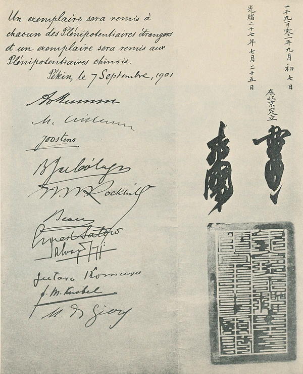 В результате Ихэтуаньского восстания и последующих событий китайский народ и вся Цинская империя оказались в худшем положении, чем до этого. Во время восстания в странах коалиции шли дискуссии о «наказании» китайцев за покушение на жизнь европейцев и дипломатов стран Западной Европы, во многом ставшие ответом на соответствующее заявление правительства Германии. В британской прессе высказывались идеи о «наказании» Китая путём установления прямого протектората над ним, через его раздел или установления марионеточного правительства, однако большинство полагало, что заявление правительства Германии должно быть осуждено, а раздел или установление оккупационной администрации или марионеточного правительства лишь вызовет дополнительные проблемы[19]. В итоге правительства стран коалиции навязали Китаю очередной неравноправный договор, названный «Заключительным протоколом» или «Боксёрским протоколом». Протокол был подписан ещё до окончания военных действий 7 сентября 1901 года. С одной стороны договор заключило Цинское правительство, с другой — США, Япония, Германия, Австро-Венгрия, Россия, Великобритания, Франция, Италия, Испания, Бельгия и Нидерланды.