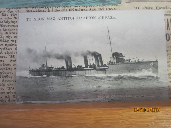 В 1912 году, перед надвигающимися Балканскими войнами, почти готовые к сдаче, корабли были выкуплены в срочном порядке правительством Греции по цене 148 тыс. фунтов каждый. Другими кораблями этой серии греческих эсминцев были «Леон» (греч. Λέων — «лев»), «Пантир» (греч. Πάνθηρ — «пантера») и «Аэтос» (греч. Αετός — «орёл»). В силу данных им имён, за этой серией эсминцев на греческом флоте закрепилось имя «Звери» (греч. Θηρία — «звери», «хищники»). Корабль был перегнан иностранным экипажем из Англии в Палермо, Сицилия, где его принял греческий экипаж, под командованием капитана А. Миаулиса.