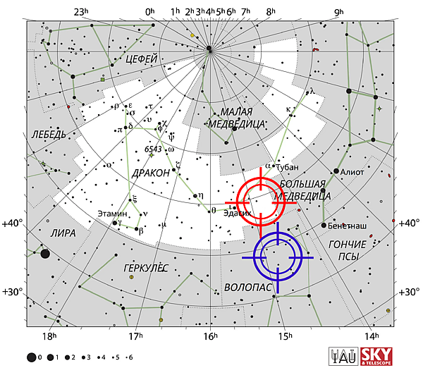 Июньские Боотиды обладают очень рассеянным радиантом из-за быстрых изменений орбиты родительской кометы под действием гравитации Юпитера[5]. Угловой диаметр радианта больше 5°[5]. Он лежит у границы созвездий Волопас и Дракон, к востоку или юго-востоку от «ручки» Большого Ковша (рис. 1). В современную эпоху экваториальные координаты радианта на небесной сфере: прямое восхождение α = 220,1—225,8° (14h 40m — 15h 03m); склонение δ = +47,3—48,6°[9][2][4][6] (созвездие Волопас). В качестве средних значений координат иногда указываются значения α = 223° (14h 52m), δ = +58°[5]. Это положение соответствует созвездию Дракон и находится неподалёку от звезды йота Дракона (ι Дракона, Эдасих), вследствие чего данный поток также называют Йота-Драконидами[1].
