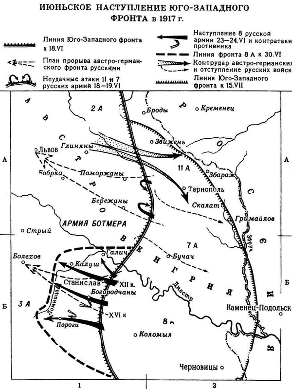 Начавшееся 23 июня (6 июля) наступление VIII армии генерала Л. Г. Корнилова, наносившей удар на участке Галич — Станислав в направлении Калуш, Болехов, было очень успешным, чему способствовали громадный перевес в силах (128 тысяч русских войск против 54 тысяч австро-венгров) и слабая боеспособность частей 3-й австро-венгерской армии, стоявшей против VIII армии. Прорвав оборону противника, 8-я армия захватила свыше 7 тыс. пленных и 48 орудий; развивая успех, она заняла Станислав, Галич и Калуш и к 30 июня (13 июля) вышла на р. Ломница. За понесённое поражение командующий 3-й австро-венгерской армией генерал-полковник К. фон Терстянски был снят с должности и заменён генерал-полковником К. Кржитеком. Но и в этой армии начались те же проблемы, что и у соседей — «ударники» понесли огромные потери в первых штурмовых боях, а остальная солдатская масса отказывалась воевать. Более того, после взятия Калуша многие части вышли из-под контроля, в городе был устроен массовый погром. И русские, и австрийцы срочно перебросили к Калушу подкрепления, но последние опередили, нанесли контрудар и в ночь на 3 (16) июля выбили русских из Калуша[11].