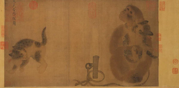 - Обезьяна сидящая на земле и держащая кошку на груди, вторая кошка наблюдает. Прекрасная работа в манере гун-би в бледных тонах. Свиток. Надпись Хуэйцзуна. Колофоны Чжао Мэнфу и Чжана Си. Подлинник? Гугун, Тайбэй