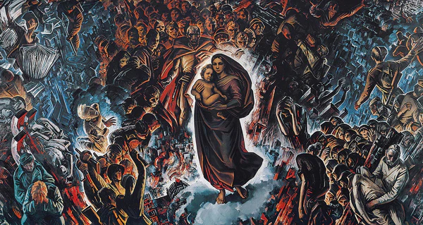 Именно эта фигура Мадонны с младенцем — смысловой центр моей работы. Она — смысл того, что советские воины освободили мир, спасли саму жизнь и культуру человечества от фашизма. Среди изображённых на картине и солдаты, празднующие победу, и жертвы последних боёв, и отец-солдат с убитым сыном, и пленные немцы[5].