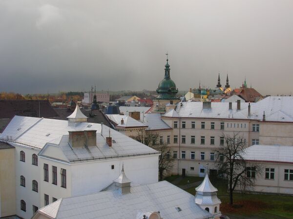 - Главная площадь огромных размеров; считается, что это самая большая площадь Чехии, на ней расположены:
