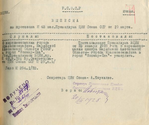 23 января 1928 года Постановлением Президиума ВЦИК[прим. 1] город Краснококшайск был переименован и получил марийское национальное название — Йошкар-Ола, что в переводе с марийского языка означает «Красный город»[60]. Данное постановление было утверждено протоколом № 43 заседания Президиума ЦИК Союза ССР от 10 марта 1928 г[66]. В декабре 1936 года Марийская автономная область была преобразована в Марийскую Автономную Советскую Социалистическую Республику, и город Йошкар-Ола становится её столицей[1].