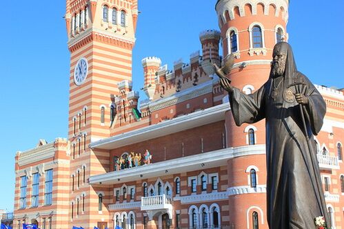В Благовещенском соборе перекликаются элементы архитектуры московского Храма Василия Блаженного и Храма Спаса-на-Крови в Санкт-Петербурге[374]. На соборе 7 золотых куполов, изготовленных мастерами из Санкт-Петербурга[375].