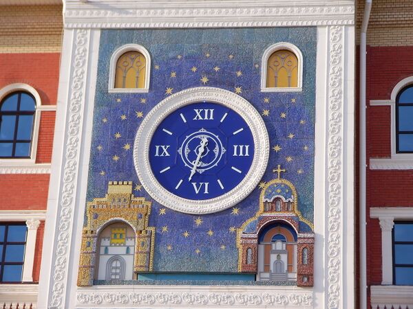 Запущены в эксплуатацию 4 ноября 2007 года в 11:00[364]. Проект реализован лабораторией «Новая техника» Поволжского Государственного Технологического университета, над проектом работало около 50 человек[364]. В основу сюжета положена история спасения Иконы Божией Матери «Троеручица»: по преданию, во время турецкого вторжения в Сербию икона была водружена на осла, который смог донести её до ворот Хиландарского монастыря на Афоне[297]. С началом каждого часа, под песнопение (часть литургии С. Рахманинова «Дева Богородица»[365]), в верхнем левом углу часов в открывающихся вратах появляется образ Божией Матери, а после в нижнем левом углу движется ослик с её образом, символизирующий чудесное спасение иконы и пришествие Богородицы на марийскую землю. Ослик въезжает в правые нижние врата. Они закрываются, а в правом верхнем углу снова появляется благословляющий образ Царицы Небесной. Скульптуры для часов создавал народный художник России Андрей Ковальчук. Масса иконы — 120 кг, масса ослика — 480 кг[365]. Эти часы — самые точные в республике, время на них корректируется сигналом со спутника[297][363].